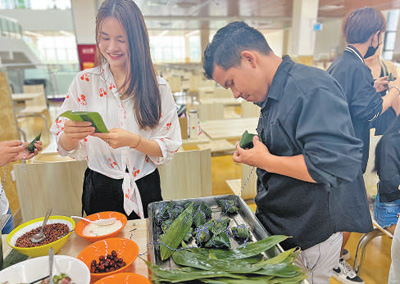 At first, I struggled to control the bamboo leaves and glutinous rice; the ingredients seemed to have a mind of their own, with rice spilling out or the whole thing falling apart. Thanks to the assistance of my teachers and classmates, I finally managed to wrap the zongzi in its emerald green leaf "clothing" and tied it up with colorful strings. After it was steamed, I took a bite and enjoyed its sweet, chewy texture. Learning about the customs and stories behind the Dragon Boat Festival also deepened my understanding of Chinese history.