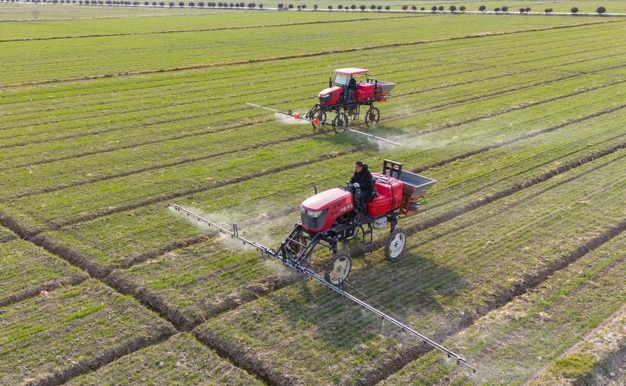 An aerial drone photo shows farmers operating machines for pest control at a wheat field in Yumin Village of Tongzhou District in Nantong City, east China's Jiangsu Province, Feb. 20, 2025. (Photo: Xinhua)