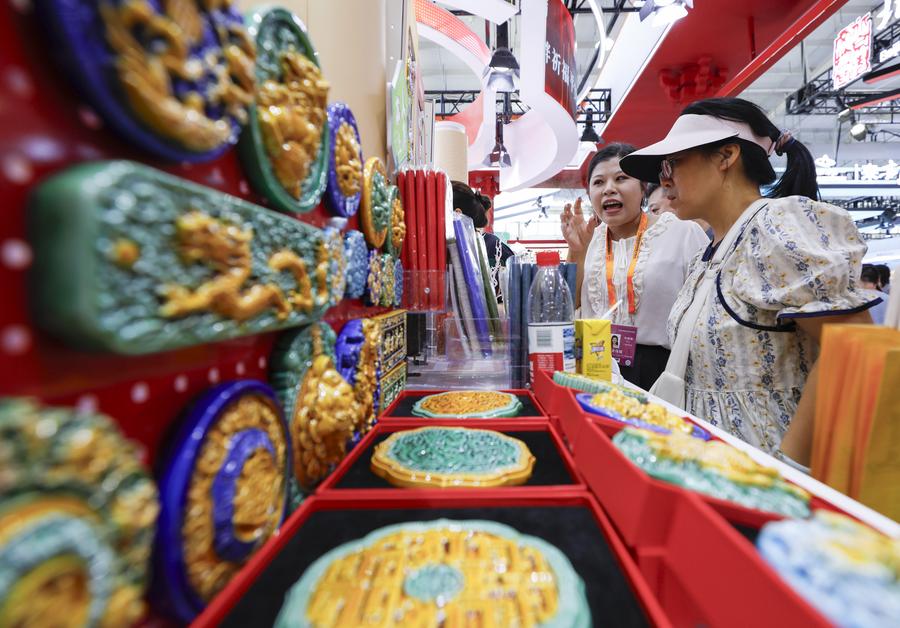 People select cultural and creative products at the Cultural & Tourism Services exhibition area during the 2025 China International Fair for Trade in Services (CIFTIS) at Shougang Park in Beijing, capital of China, Sept. 14, 2025. (File photo: Xinhua)