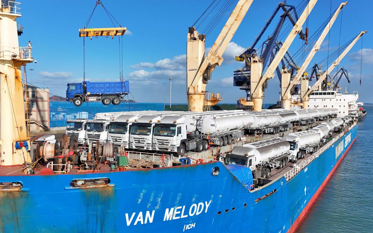 Chinese trucks bound for Africa are loaded onto a China-Africa freight vessel at Yantai Port in east China's Shandong province, Jan. 7, 2026. (Photo/Tang Ke)