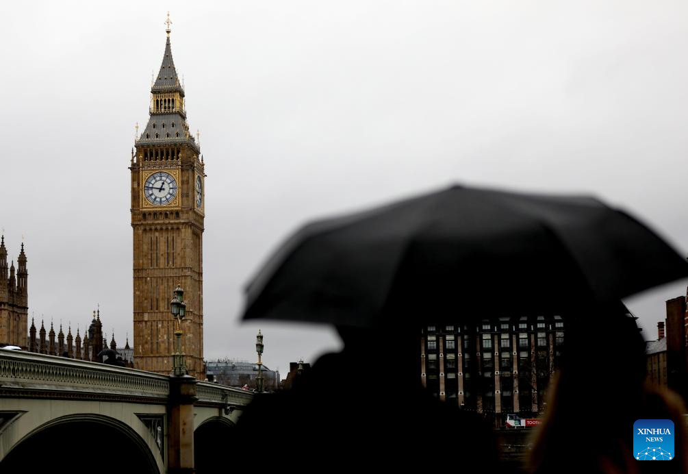People walk with umbrellas near the Big Ben in London, Britain, Jan. 27, 2026, as Storm Chandra brings rain to much of the country. (Photo: Xinhua)