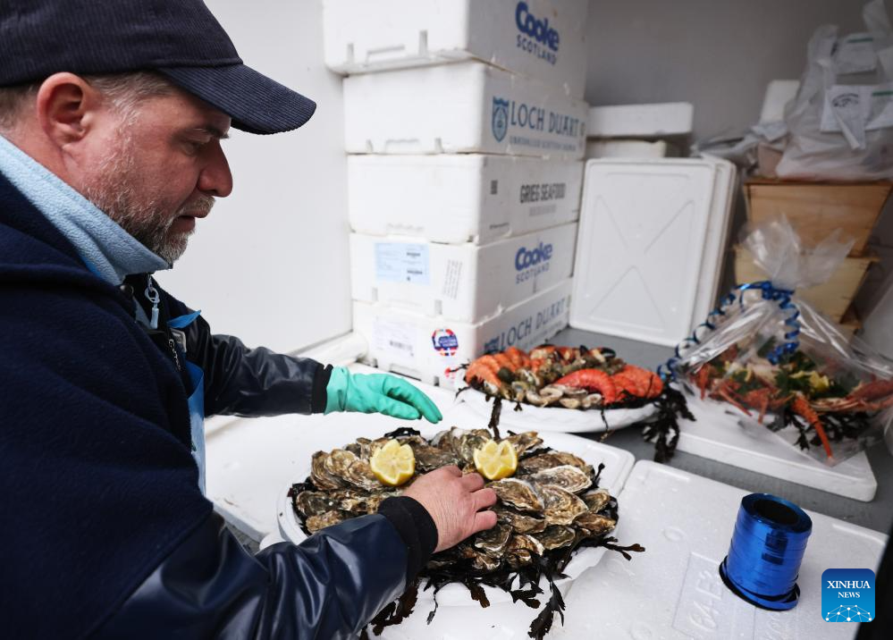 A staff member prepares a seafood platter at Maree d'Auteuil, a seafood stall, ahead of Christmas eve in Paris, France, Dec. 24, 2024. (Photo: Xinhua)