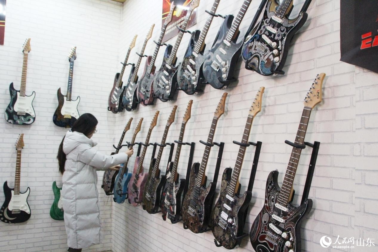 A customer selects a guitar at a guitar shop in Tangwu town, Changle county, Weifang, east China's Shandong Province. (Photo: People's Daily Online/Song Cui)
