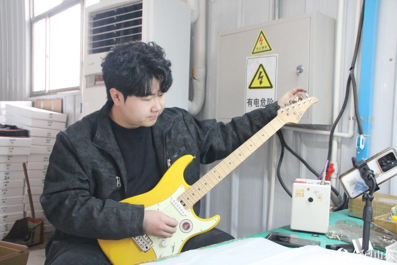 Chen Chongyang, a quality inspector, fine-tunes a guitar at a musical instrument factory in Tangwu town, Changle county, Weifang, east China's Shandong Province. (Photo: People's Daily Online/Song Cui)