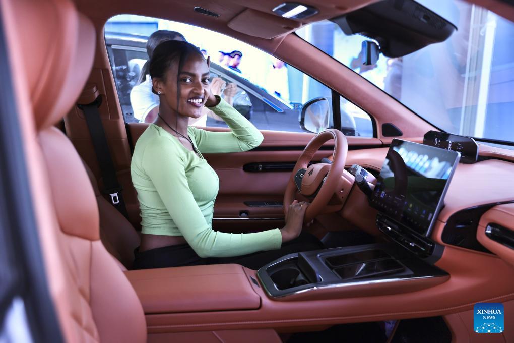 A visitor sits in a GAC car during the launching event of GAC JUNTU flagship showroom in Addis Ababa, Ethiopia, March 27, 2026. Chinese automaker Guangzhou Automobile Group Co., Ltd (GAC Group) has introduced its four new electric vehicle (EV) models to the Ethiopian market, marking a significant expansion in the East African country.(Xinhua/Geng Xinning)
