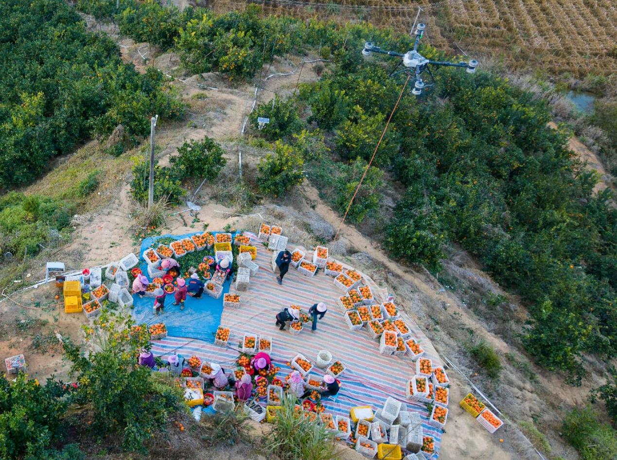 A drone transports freshly picked navel oranges from an orchard in Meizhou, south China's Guangdong province. (Photo/Feng Xiquan)