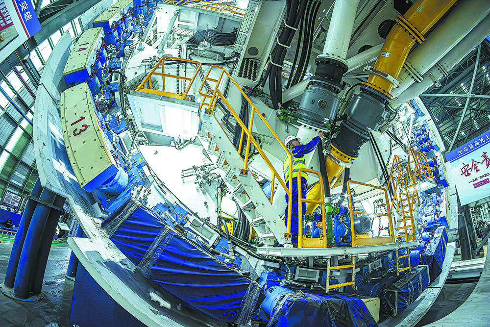A worker inspects a shield tunneling machine on Tuesday after the 14-meter-diameter shield machine developed by China Railway Construction Corporation rolled off the production line in Nantong, Jiangsu province. (Photo: Xinhua)