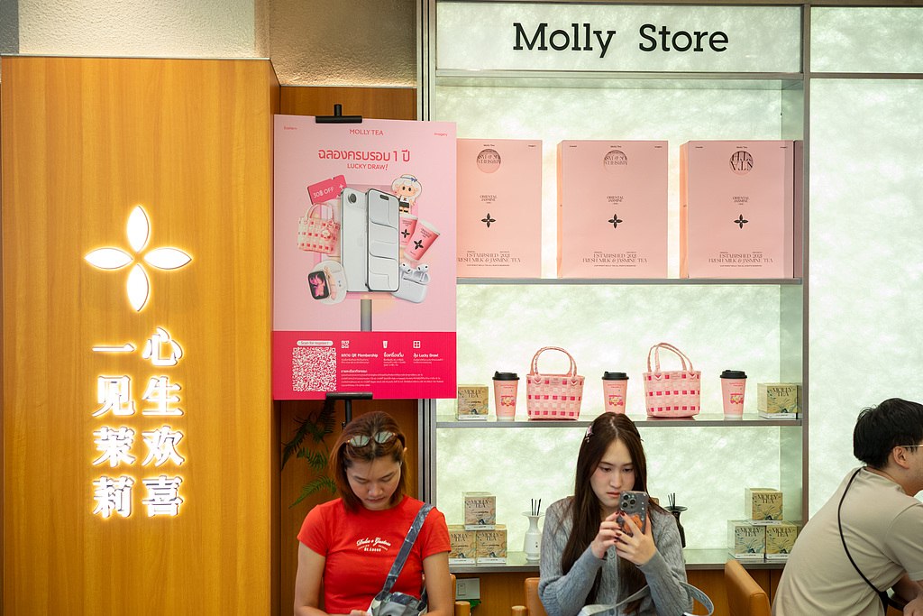 Customers wait next to a brand slogan in Chinese characters at a Molly Tea shop at the Siam Square in Bangkok, Thailand, on Oct 7, 2025. (Photo: VCG)