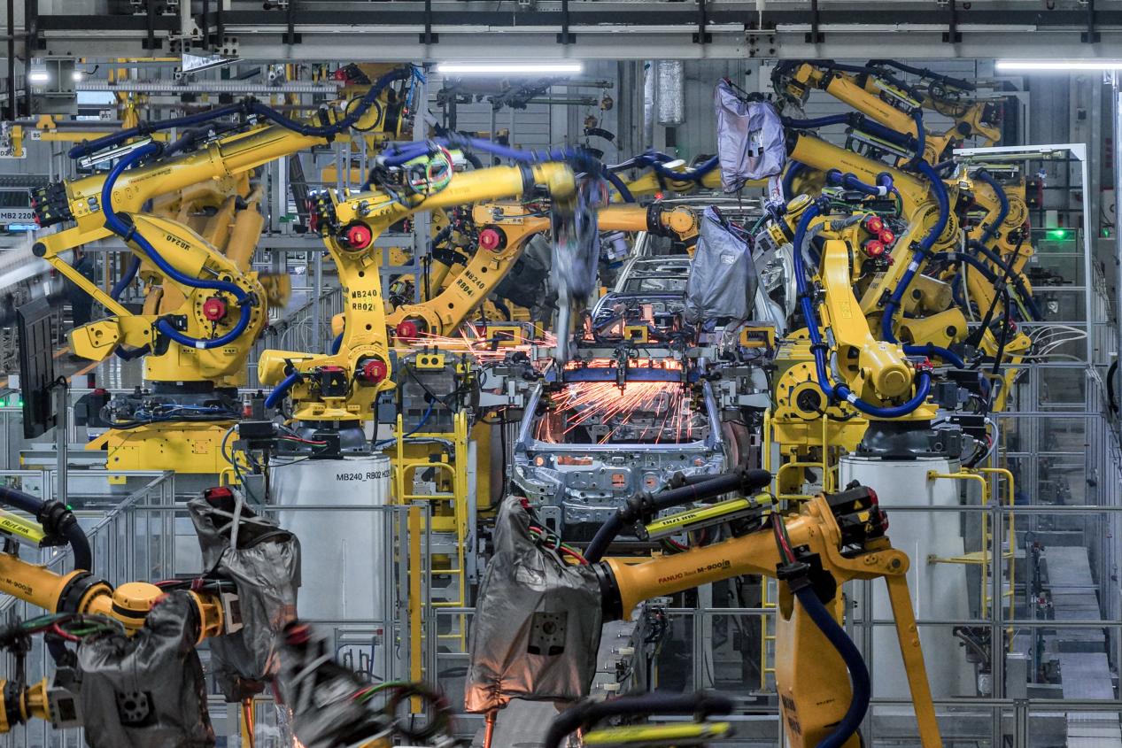 Robotic arms weld car frames in a smart factory of Chinese automaker Seres in Liangjiang New Area, southwest China's Chongqing municipality. (Photo/Wang Jiaxi)