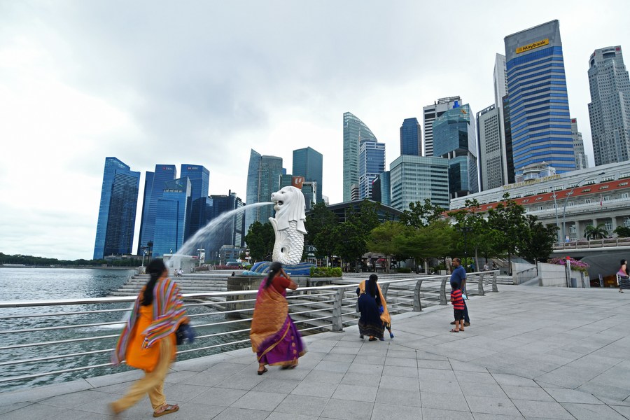 People visit the iconic tourist attraction Merlion Park in Singapore on April 7, 2022. (Photo: Xinhua)
