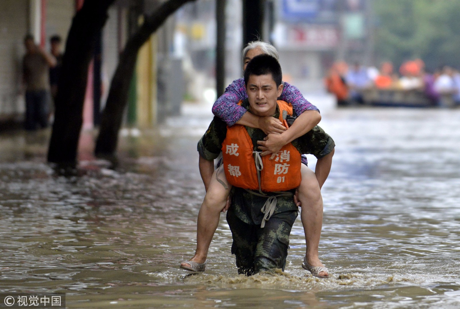 A firefighter carries an old woman through floodwaters in Chengdu, southwest China’s Sichuan Province on July 9, 2013.