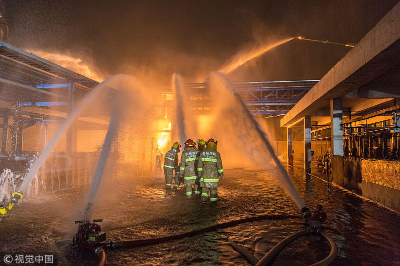A Taizhou fire brigade puts out a fire on Nov. 25, 2016. A fireball burns in the night sky when a fire breaks out in the chemical storage facility in Taixing, east China’s Jiangsu Province.