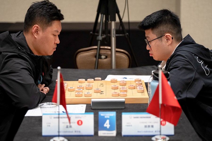 Meng Chen (L) of China competes against Cheng Yin Lung of China's Hong Kong during the men's individual round 2 match at the 18th World Xiangqi Championship in Houston, Texas, the United States, on Nov. 20, 2023. (Photo: Xinhua)