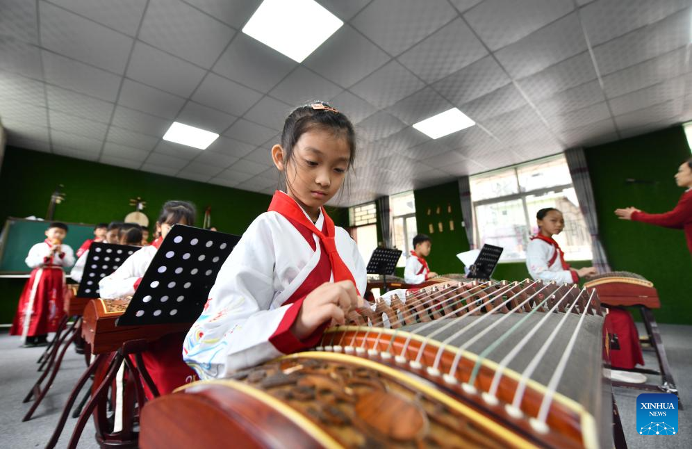 Students practice playing guzheng, a classical Chinese zither, at a school in Mengjiang Town of Tengxian County of Wuzhou, south China's Guangxi Zhuang Autonomous Region, Dec. 6, 2023. In recent years, Mengjiang Town has been making various efforts in educating local students on the culture of Danjia, which refers to a group of people who have lived off the sea for generations, folk singing and dancing as well as calligraphy and painting. (Xinhua/Huang Xiaobang)
