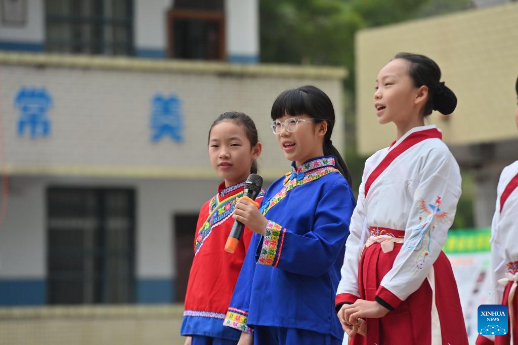 Students sing a Danjia song at a school in Mengjiang Town of Tengxian County of Wuzhou, south China's Guangxi Zhuang Autonomous Region, Dec. 6, 2023. In recent years, Mengjiang Town has been making various efforts in educating local students on the culture of Danjia, which refers to a group of people who have lived off the sea for generations, folk singing and dancing as well as calligraphy and painting. (Xinhua/Huang Xiaobang)