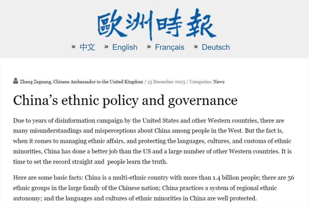 Chinese Ambassador to the UK Zheng Zeguang on Wednesday published an article headlined "China's ethnic policy and governance" in Nouvelles d'Europe (UK edition).