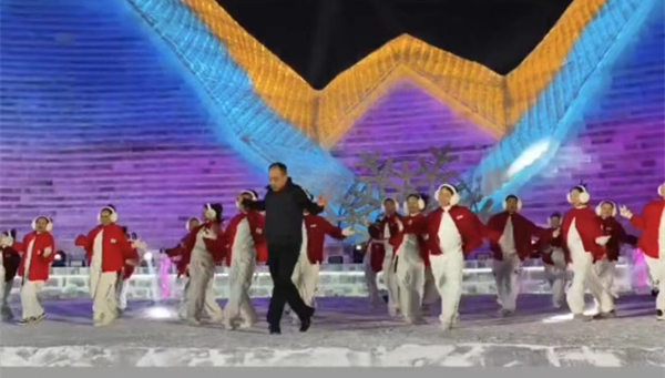 Wang Dianyou, head of Harbin's Acheng district culture and tourism bureau, danced with performers at Harbin Ice and Snow World, the world's largest theme park of its kind. Despite wearing dress shoes, his dance steps and rhythm were still on point.