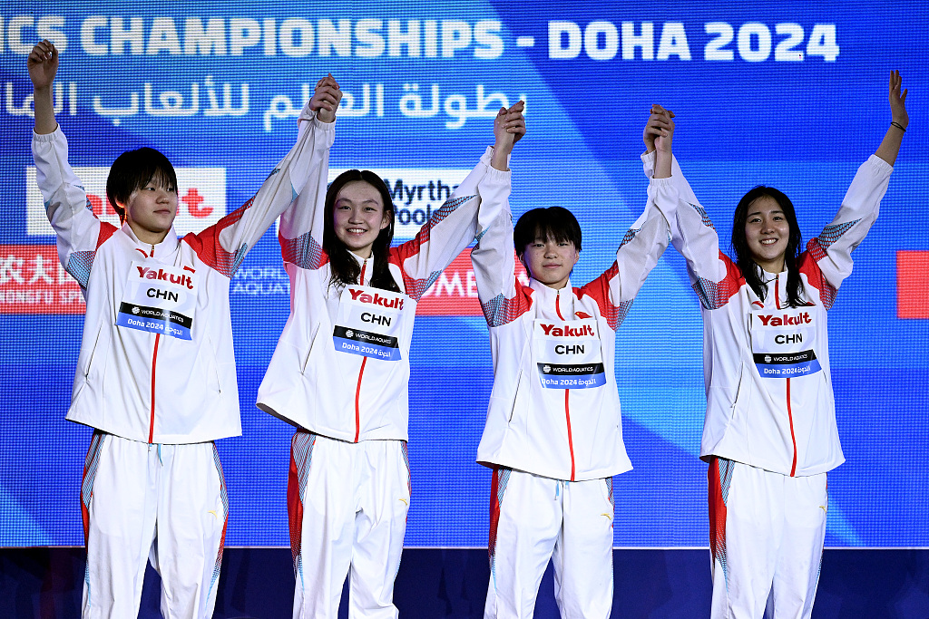 L-R: Yang Peiqi, Li Bingjie, Gong Zhenqi and Ai Yanhan of China celebrate after winning the women's 4x200-meter freestyle relay gold medal at the World Aquatics Championships in Doha, Qatar, February 15, 2024. (Photo: CFP)