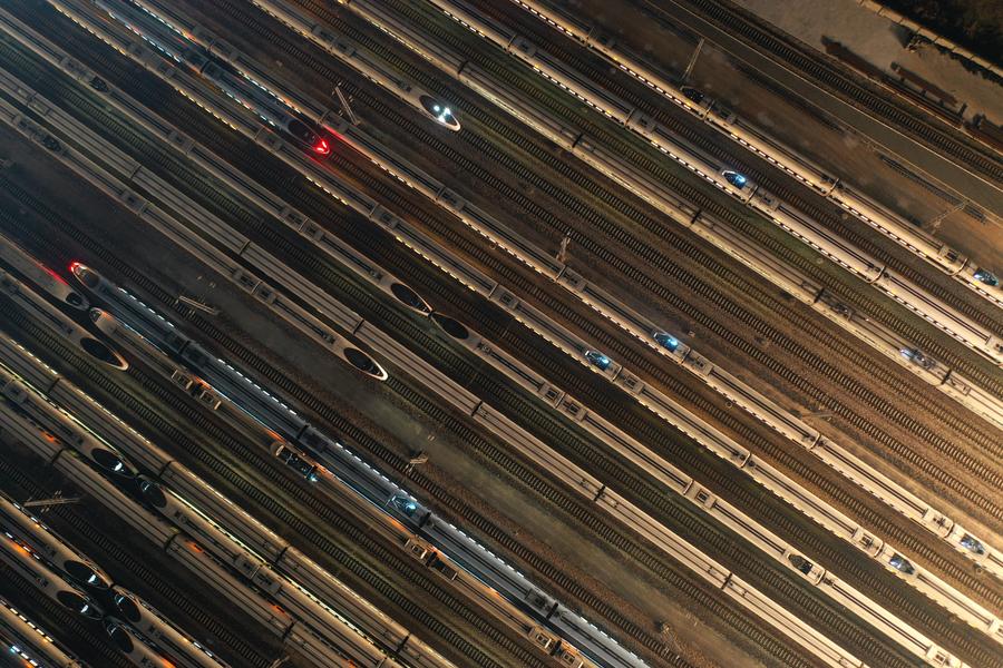 An aerial drone photo taken on Jan. 26, 2024 shows bullet trains at a maintenance base in Nanjing, east China's Jiangsu Province. (Photo: Xinhua)