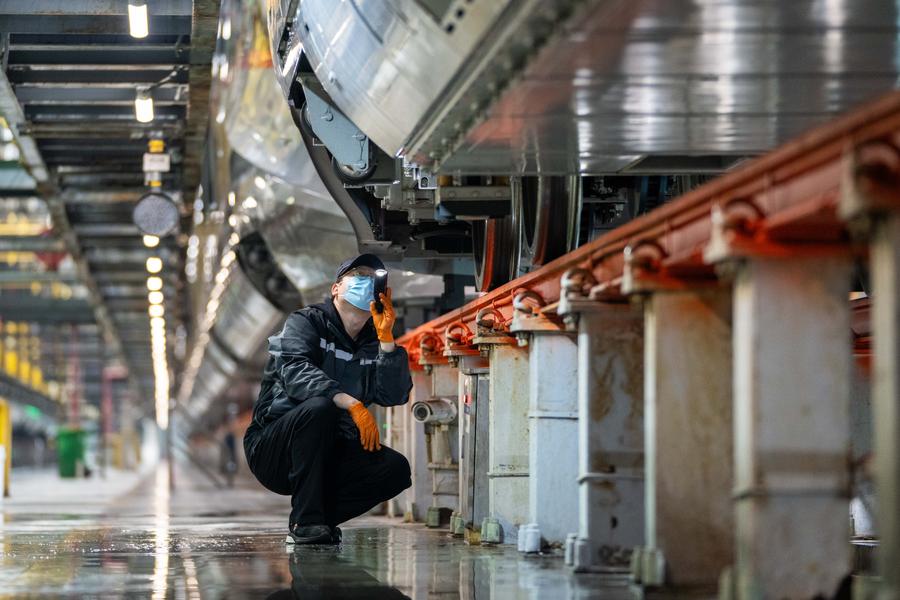 A mechanic checks a bullet train at a maintenance base in Changsha, central China's Hunan Province, Jan. 25, 2024. (Photo: Xinhua)