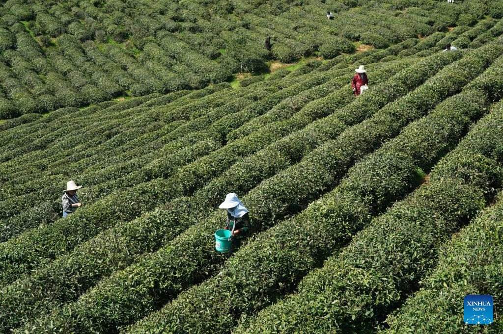 Farmers pick tea leaves at tea gardens in Ninghong Village in Xiushui County, East China's Jiangxi Province, March 28, 2024. (Photo: Xinhua)
