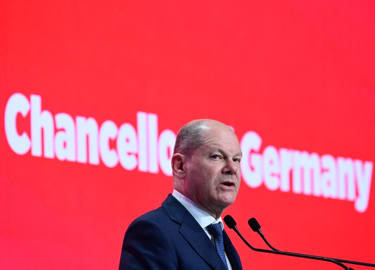 German Chancellor Olaf Scholz delivers a speech at the Romanian Parliament's headquarters during the 'We stand together – for our Europe!' conference and leaders meeting organized by The Party of European Socialists (PES) in Bucharest, Romania on April 6, 2024. (Photo: AFP)