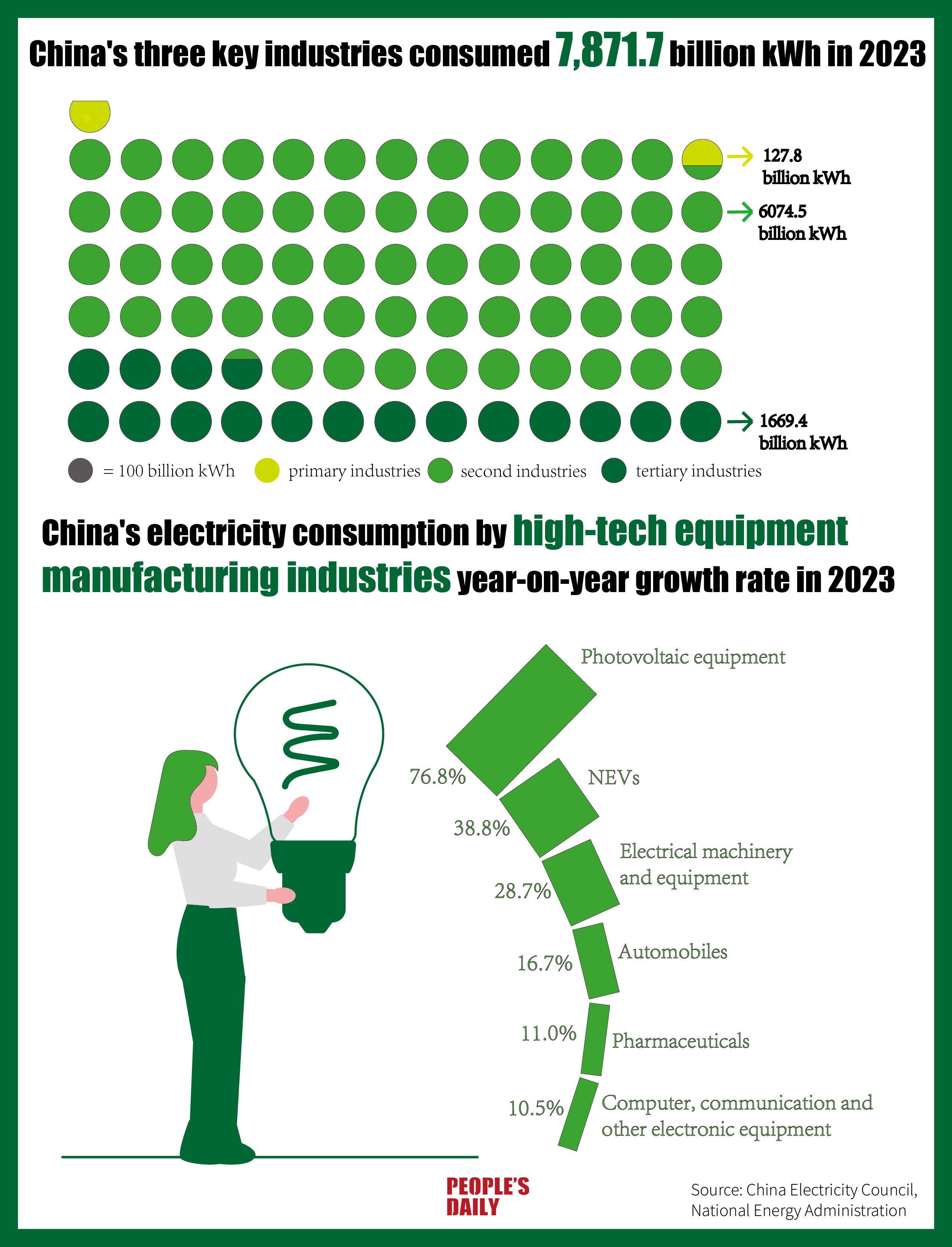 China's new quality productive forces are driving the growth of high-tech and innovative products, resulting in rapid electricity consumption growth in three key industries: primary (raw materials), secondary (finished goods), and tertiary (service sector). China's electricity consumption in these industries reached 7,871.7 billion kilowatt-hours (kWh) in 2023.