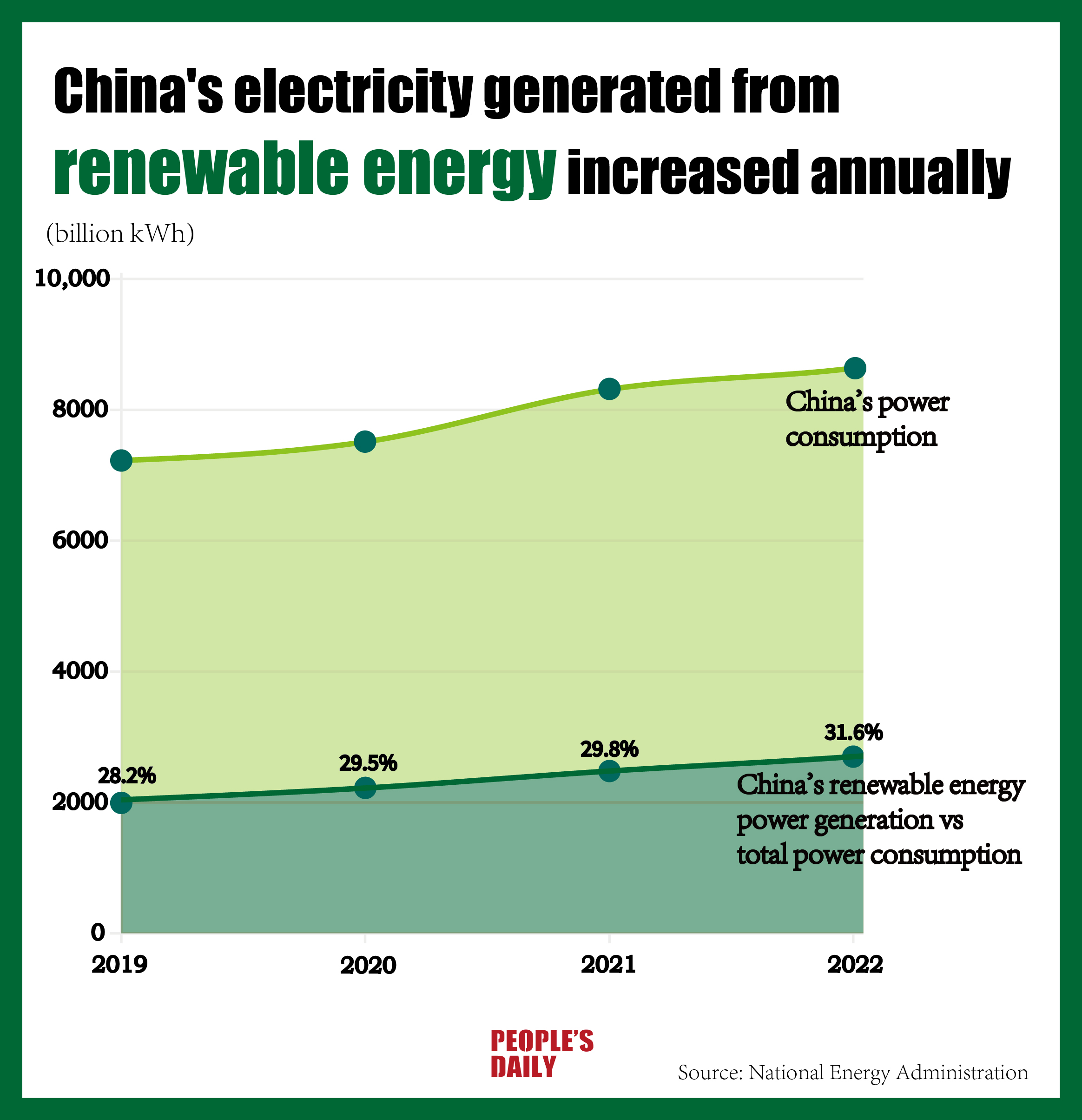 From 2019 to 2022, China's electricity consumption, a key barometer of economic activity, maintained stable growth, while the amount of electricity generated from renewable energy compared to China's total electricity consumption grew from 28.2 percent to 31.6 percent.