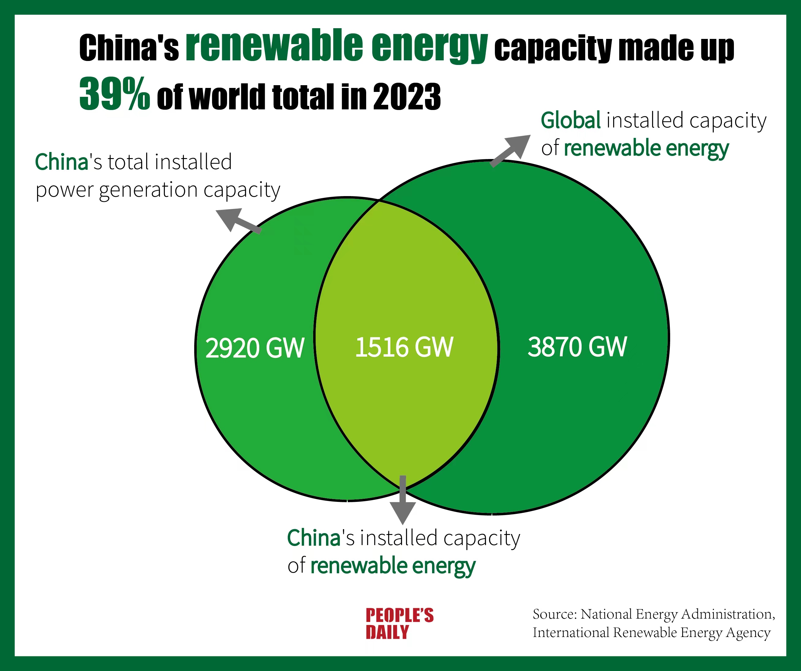 Meanwhile, China's installed renewable energy capacity exceeded 1,516 gigawatts in 2023, accounting for more than 50 percent of the country's total installed power generation capacity and 39 percent of global renewable energy capacity.