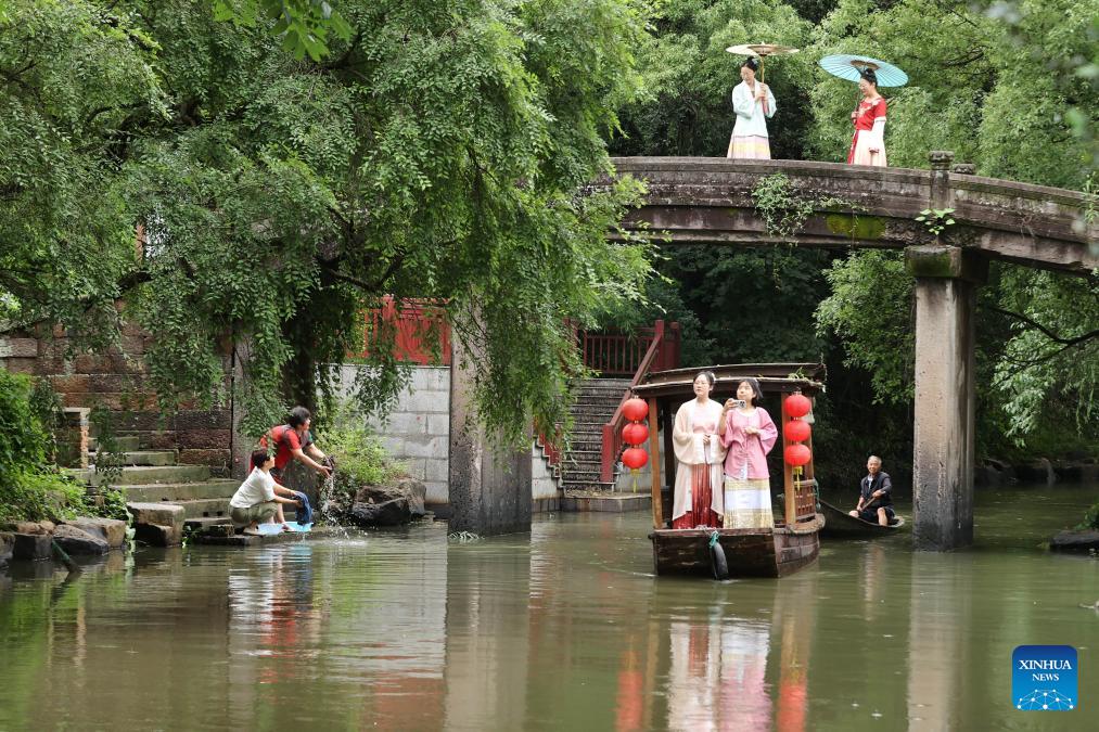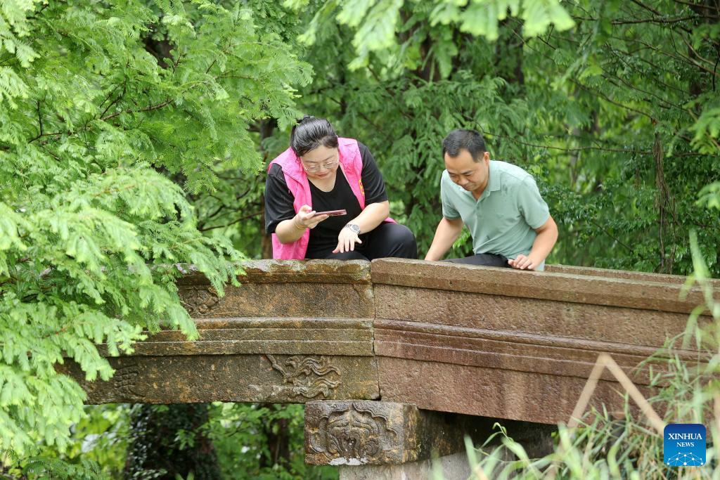 People visit the Puji Bridge in Lishan Village of Zhongguan Town, Deqing County, east China's Zhejiang Province, June 24, 2024. Deqing County is home to seven ancient stone bridges which are listed as major cultural heritage sites under state-level protection. In recent years, the county has spared no effort in the protection and renovation of ancient stone bridges, while promoting the integration of its heritage resources with cultural tourism and research trips. (Photo: Xinhua)