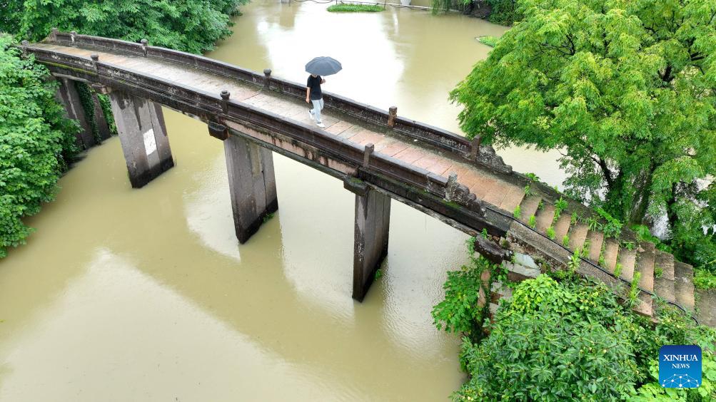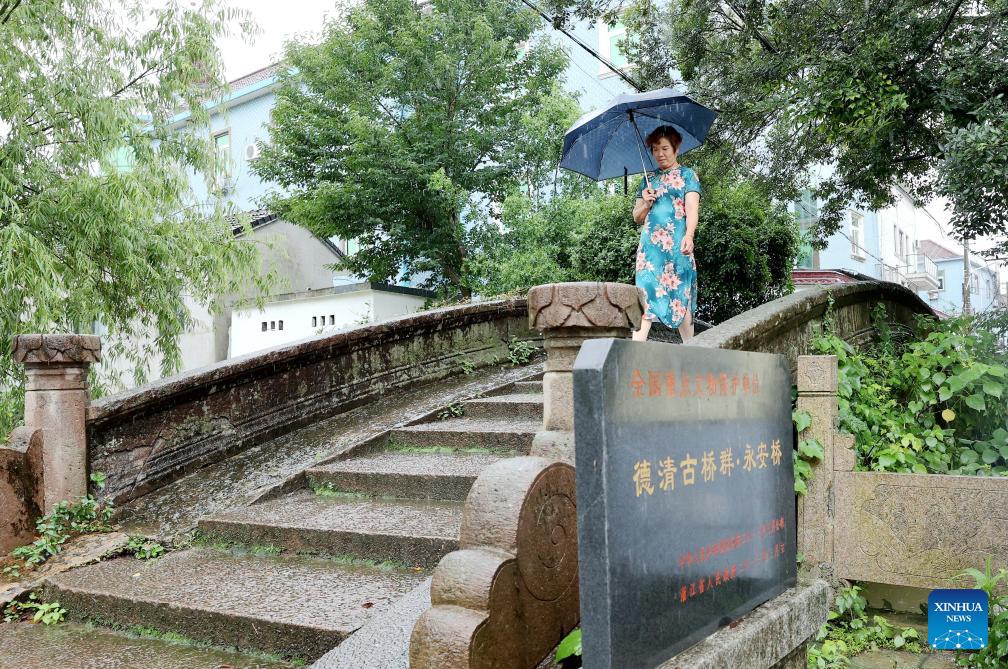 A woman walks on the Jianji Bridge in Longsheng Village of Deqing County, east China's Zhejiang Province, June 27, 2024. Deqing County is home to seven ancient stone bridges which are listed as major cultural heritage sites under state-level protection. In recent years, the county has spared no effort in the protection and renovation of ancient stone bridges, while promoting the integration of its heritage resources with cultural tourism and research trips. (Photo: Xinhua)