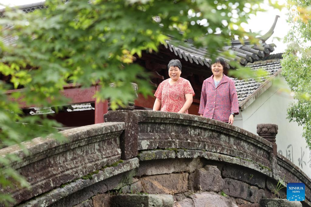 People walk on the Wanshan Bridge in Shebei Village of Xin'an Town, Deqing County, east China's Zhejiang Province, June 26, 2024. Deqing County is home to seven ancient stone bridges which are listed as major cultural heritage sites under state-level protection. In recent years, the county has spared no effort in the protection and renovation of ancient stone bridges, while promoting the integration of its heritage resources with cultural tourism and research trips. (Photo: Xinhua)