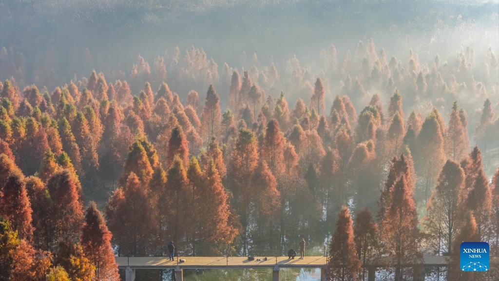 An aerial drone photo taken on Jan. 14, 2026 shows a dawn redwood wetland in Panlong District, Kunming, southwest China's Yunnan Province. (Xinhua/Hu Chao)