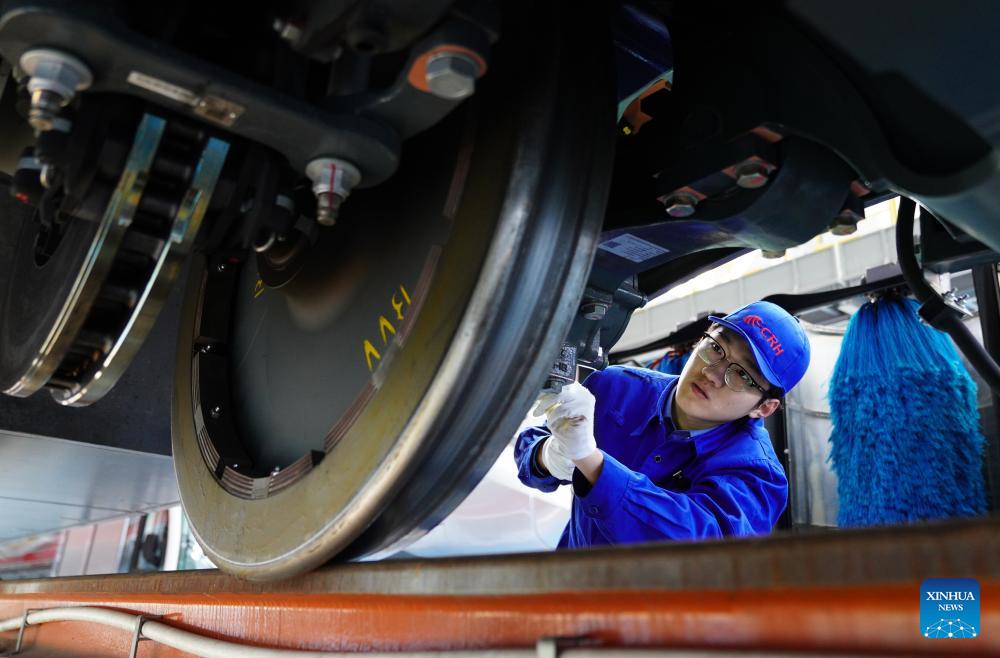 A staff member conducts maintenance work at a high-speed train base in Beijing, capital of China, Jan. 20, 2026. With the approach of the Spring Festival, high-speed train staff members in Beijing are engaging in busy preparations to better serve the Spring Festival travel rush. (Xinhua/Li An)