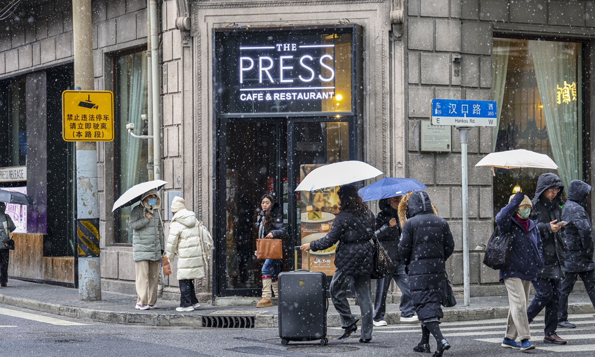 Local residents brave the snow in Hankou Road, Huangpu District of Shanghai on January 20, 2026. (Photo: VCG)