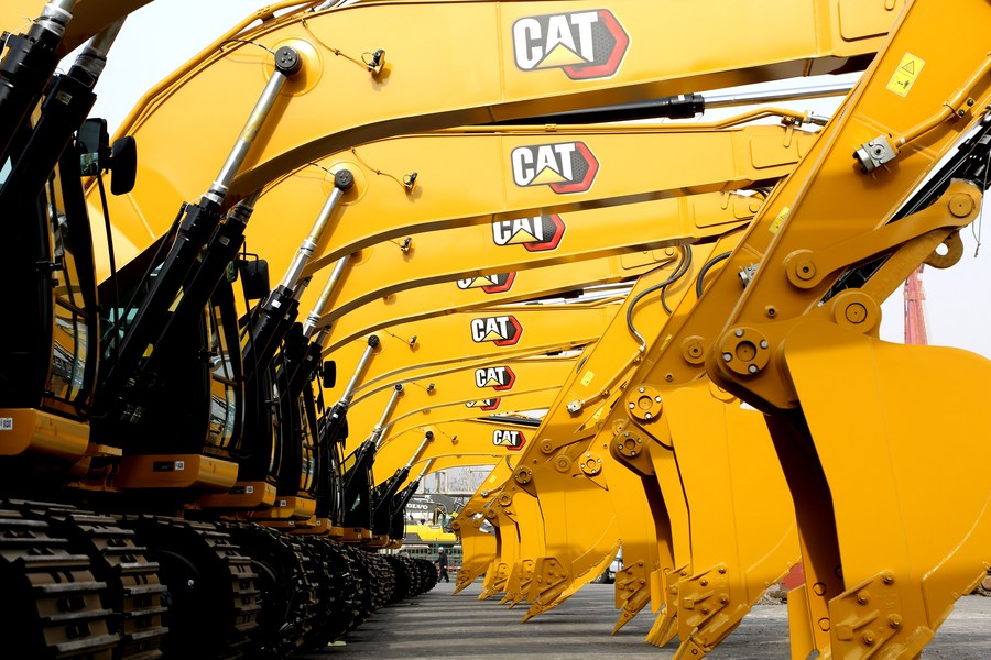 This photo taken on March 15, 2023 shows excavators to be shipped at a port in Lianyungang, east China's Jiangsu Province.(Photo: Xinhua)