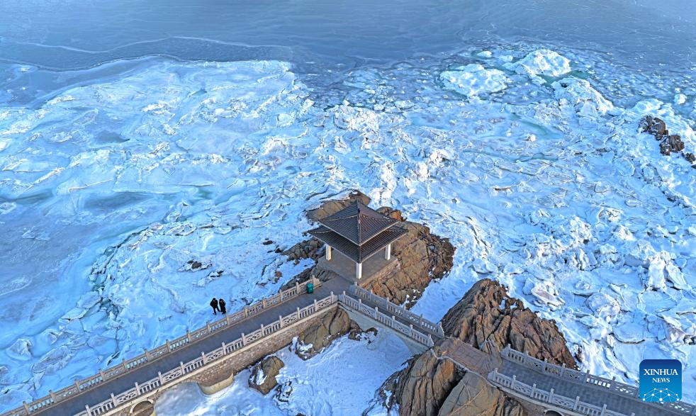 A drone photo taken on Jan. 21, 2026 shows a view over sea ice in Suizhong County of Huludao City, northeast China's Liaoning Province. (Xinhua/Pan Yulong)