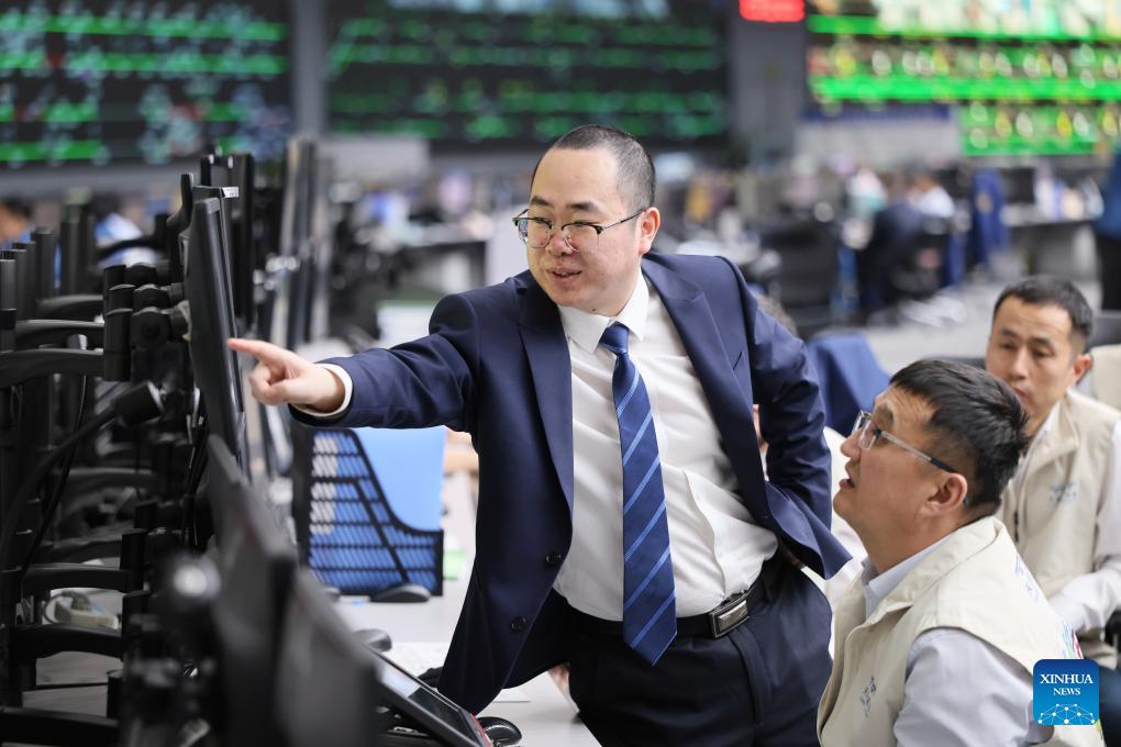 An instructor (L) communicates with a trainee from Kazakhstan at a dispatching center of Tianjin Rail Transit in north China's Tianjin Municipality, Jan. 23, 2026. Some 20 specialist trainees from Kazakhstan recently attended a hands-on training session for operations in light-rail dispatching hosted by the Tianjin Rail Transit.