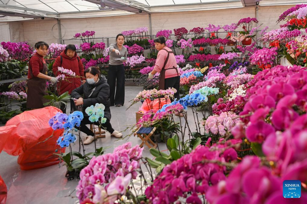 People select flowers at a floral trading center in Qingzhou City, east China's Shandong Province, Jan. 22, 2026. Chinese people are busy preparing fresh flowers, Chinese knots, spring couplets, and other traditional necessities to celebrate the upcoming Spring Festival, or the Chinese New Year. (Photo by Wang Jilin/Xinhua)