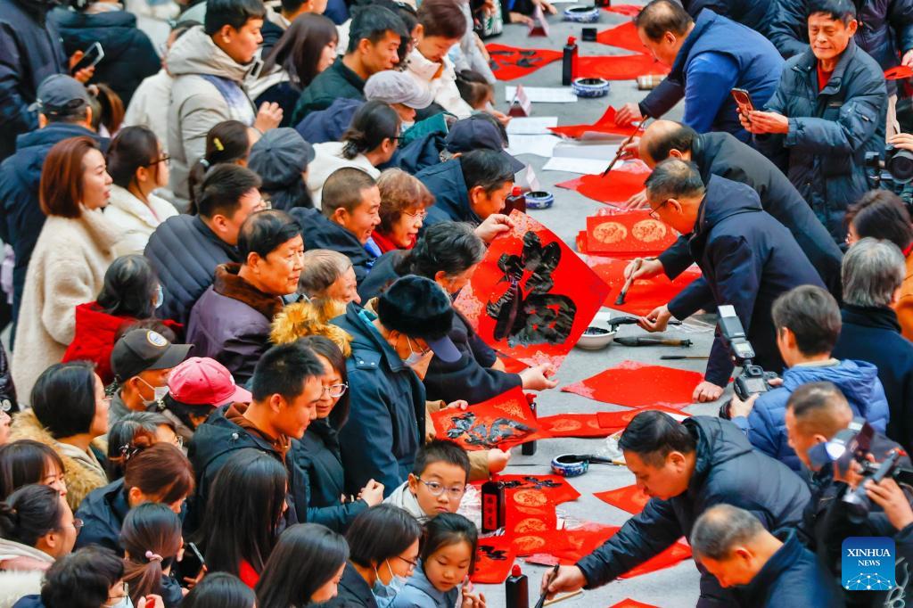 Artists write spring couplets and Chinese character "Fu," which means good fortunes, for citizens at a cultural center in Tianjin, north China, Jan. 22, 2026. Chinese people are busy preparing fresh flowers, Chinese knots, spring couplets, and other traditional necessities to celebrate the upcoming Spring Festival, or the Chinese New Year. (Photo by Du Penghui/Xinhua)