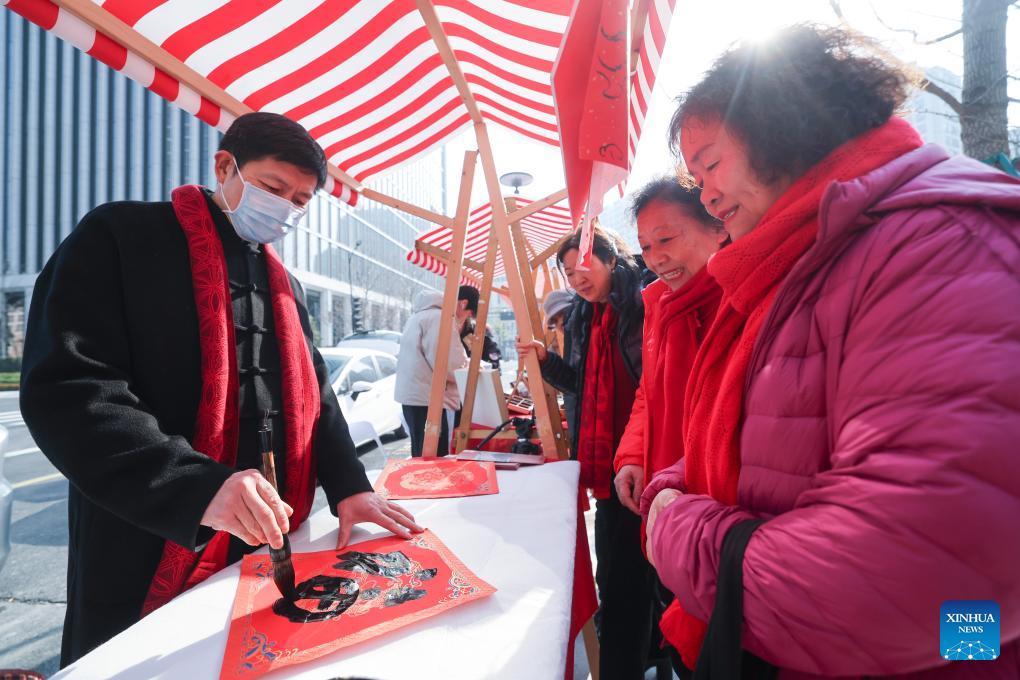 A calligrapher writes the Chinese character "Fu" (meaning "Fortune") as presents for visitors during a fair featuring intangible cultural heritage and Chinese New Year goods in Hangzhou, east China's Zhejiang Province, on Jan. 24, 2026. Kicking off in Hangzhou on Saturday, the event blends traditional festivities with modern trends, offering visitors an immersive experience of cultural crafts, holiday shopping, and folk performances. (Xinhua/Xu Yu)