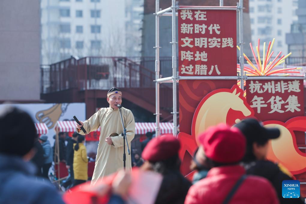 A folk artist performs "Xiao Re Hun", a traditional form of stand-up comedy in Hangzhou dialect, during a fair featuring intangible cultural heritage and Chinese New Year goods in Hangzhou, east China's Zhejiang Province, on Jan. 24, 2026. Kicking off in Hangzhou on Saturday, the event blends traditional festivities with modern trends, offering visitors an immersive experience of cultural crafts, holiday shopping, and folk performances. (Xinhua/Xu Yu)