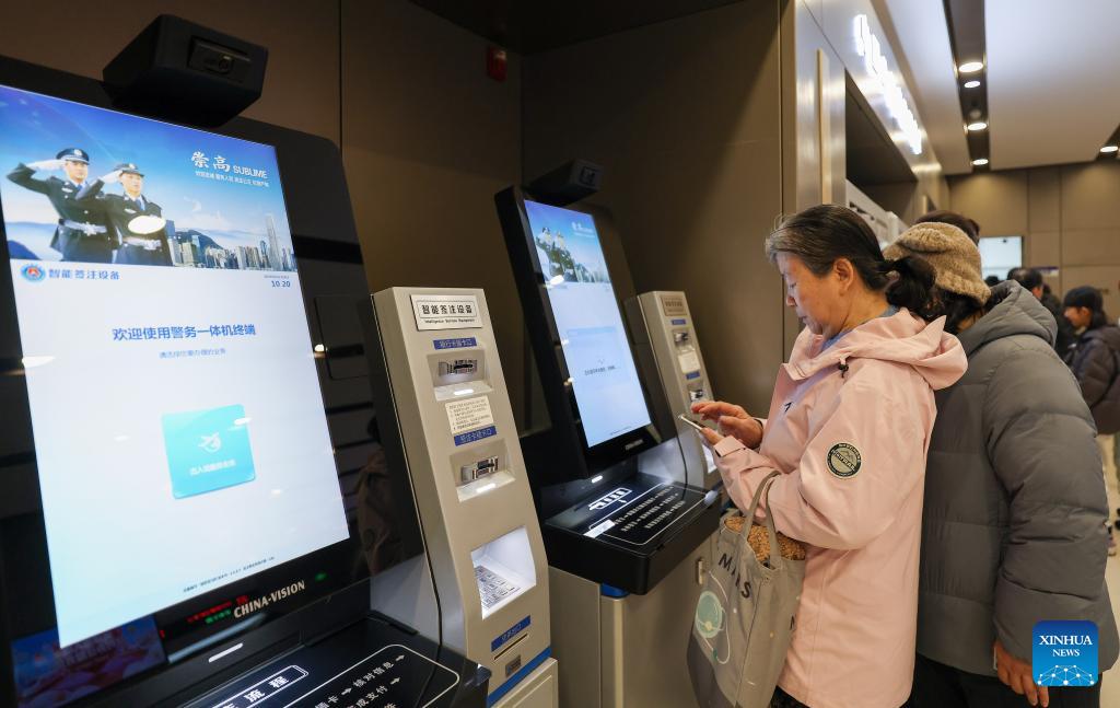 Citizens use a self-service machine to process visa applications at the exit-entry services hall of Tianjin Municipal Public Security Bureau in north China's Tianjin Municipality, Jan. 24, 2026. The exit-entry administration division of Tianjin Municipal Public Security Bureau on Saturday launched a campaign to facilitate the processing of travel documents during the peak travel season around the Spring Festival holiday. Citizens can expect shorter waiting times as more service counters are opened and service hours are extended. (Xinhua/Sun Fanyue)