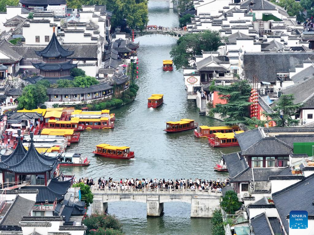 An aerial drone photo taken on Oct. 1, 2025 shows people visiting Confucius Temple scenic area in Nanjing, east China's Jiangsu Province. China recorded 888 million domestic tourist trips during the eight-day National Day and Mid-Autumn Festival holiday, up 123 million from the seven-day National Day holiday in 2024, the Ministry of Culture and Tourism said Thursday. (File photo: Xinhua)