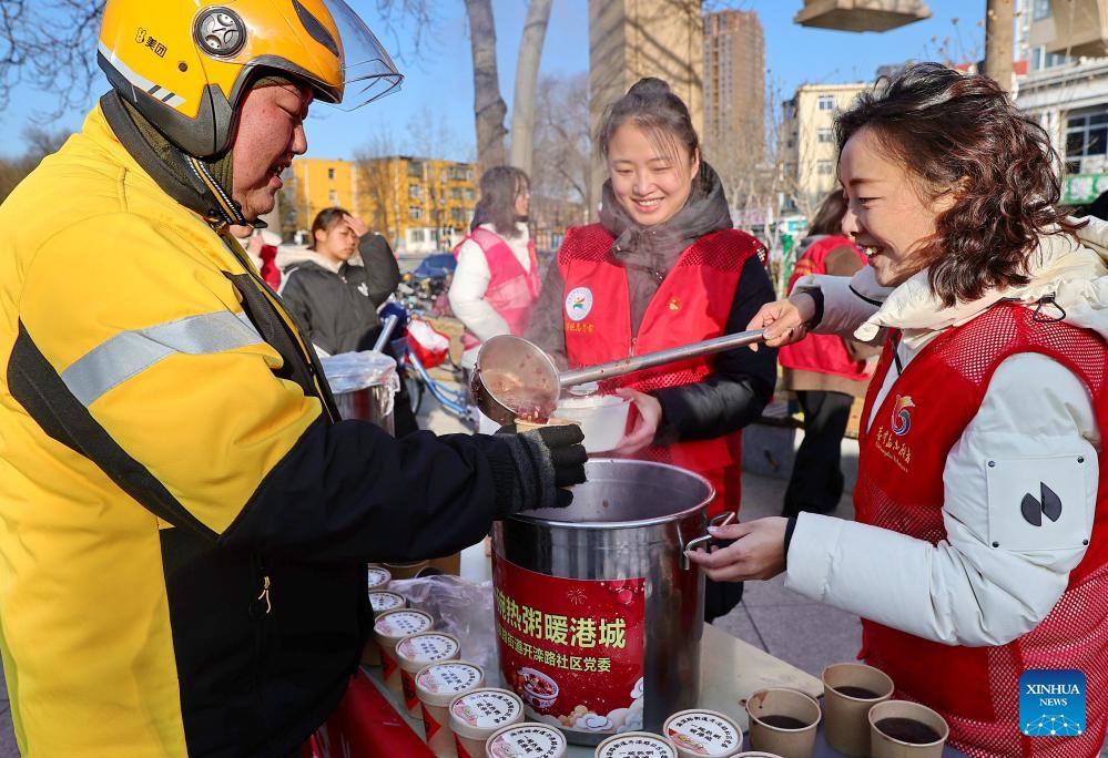 Volunteers serve Laba porridge to a food delivery courier in Haigang District of Qinhuangdao, north China's Hebei Province, on Jan. 25, 2026. Various activities were held across the country to celebrate the Laba Festival that falls on Jan. 26 this year. (Photo by Cao Jianxiong/Xinhua)