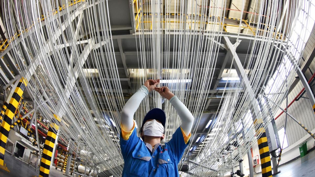 This undated photo captures a worker checking the operation of a carbon fiber production line at a factory in Lianyungang, Jiangsu province. (Photo: China Daily)