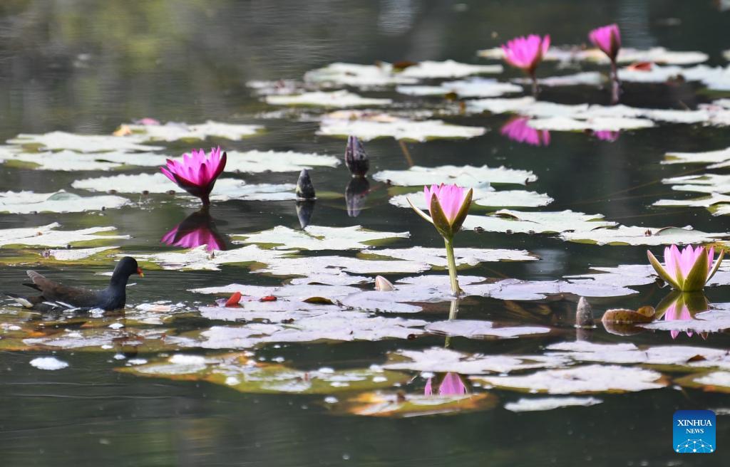 This photo taken on Jan. 27, 2026 shows a display area for water lilies at the Yunxi Botanical Garden in Guangzhou, south China's Guangdong Province. Located in the west of the Baiyun Mountain scenic area, the Yunxi Botanical Garden has opened up a display area for water lilies of over 20,000 square meters, where boasts of a variety of water lily species and an introduction, caring and developing team for the plant. (Xinhua/Deng Hua)