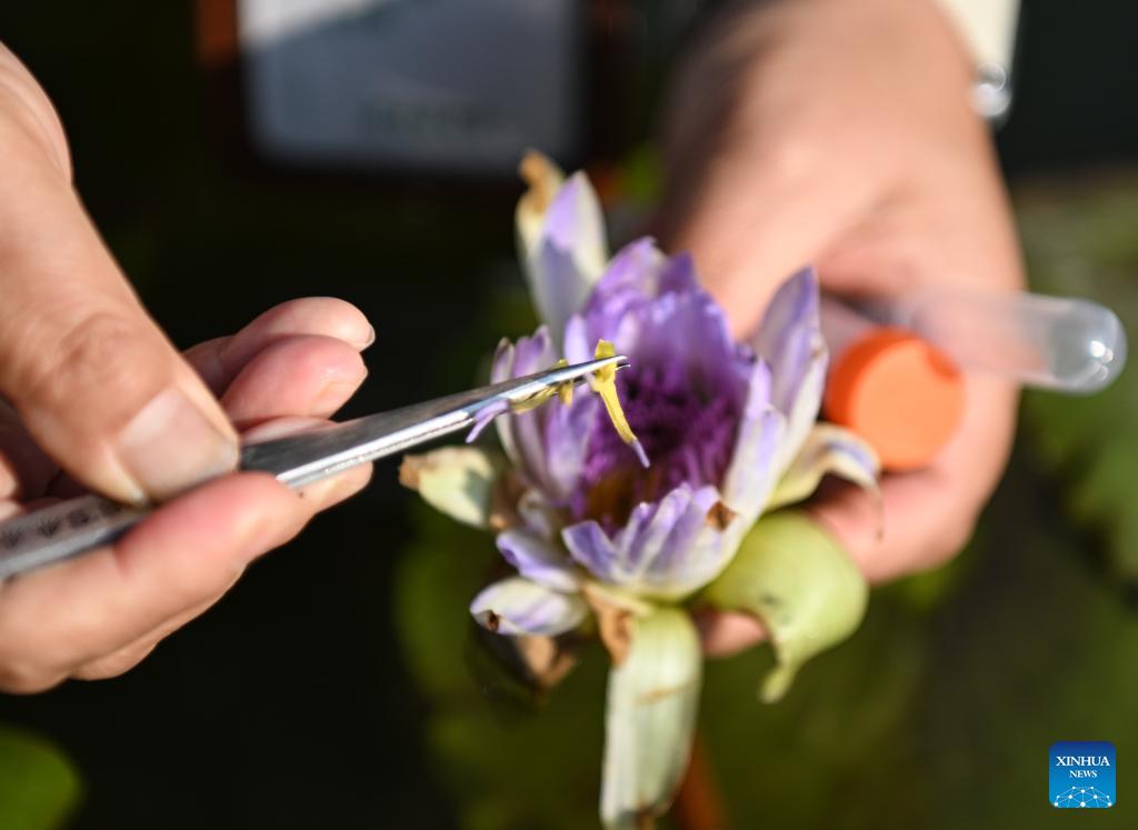 This photo taken on Jan. 27, 2026 shows a staff member collecting pollen from a water lily at the Yunxi Botanical Garden in Guangzhou, south China's Guangdong Province. Located in the west of the Baiyun Mountain scenic area, the Yunxi Botanical Garden has opened up a display area for water lilies of over 20,000 square meters, where boasts of a variety of water lily species and an introduction, caring and developing team for the plant. (Xinhua/Deng Hua)