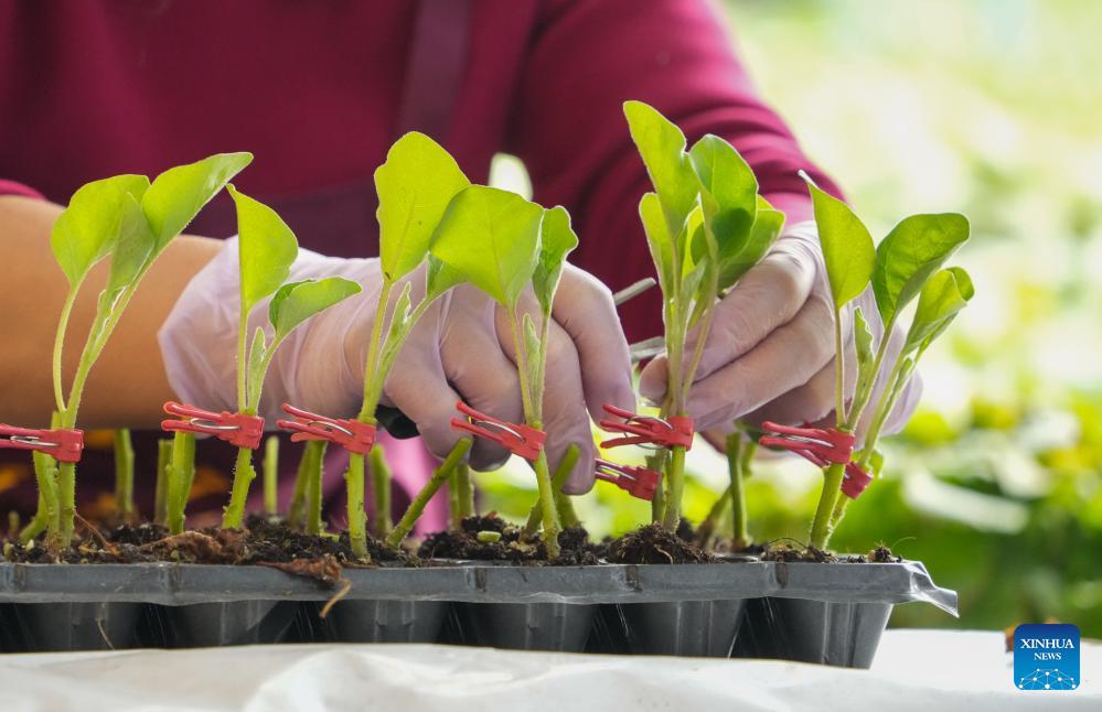 Farmers graft vegetable seedlings in greenhouse in E China's Shandong