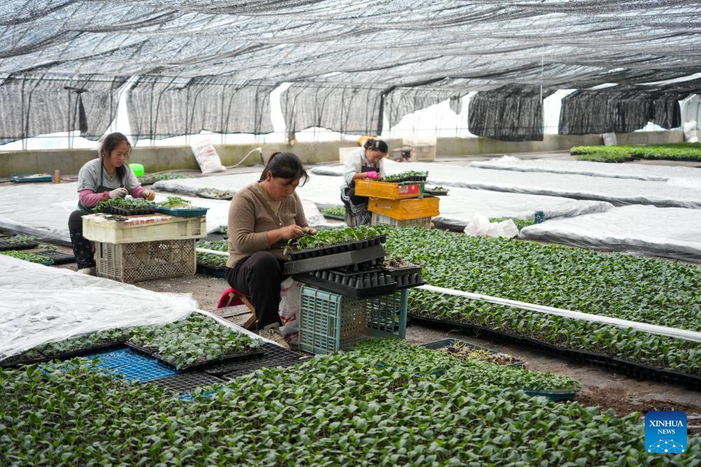 Farmers graft vegetable seedlings in a greenhouse in Yandian Town, Shenxian County, east China's Shandong Province, Jan. 28, 2026. As an important vegetable supplier, Shenxian boasts a planting area of more than 1 million mu (about 66,666.7 hectares) and the annual output reaches 5.2 million tons. (Xinhua/Xu Suhui)